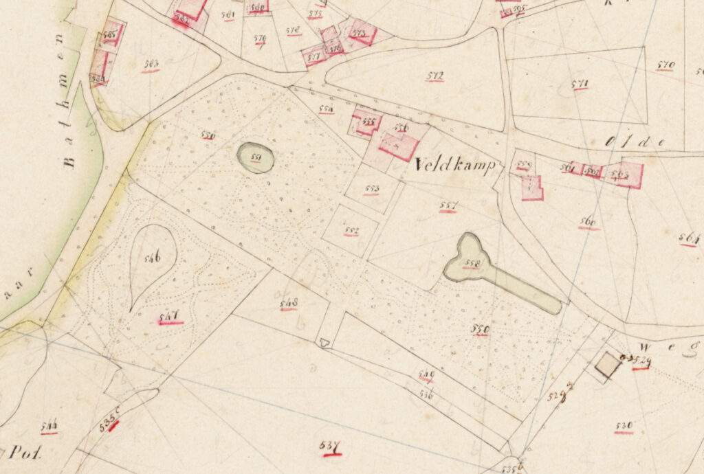 Op de kadasterkaart hierboven zie je de situatie ten zuiden van de Schoolstraat in 1832. Rechts van het woord Veldkamp stond boerderij Veldkamp, links van het woord Veldkamp stond huis Veldkamp – nu adres Schoolstraat 10. Als je in de Schoolstraat staat stond huis Veldkamp direct links van het huidige cafe Braakhekke.