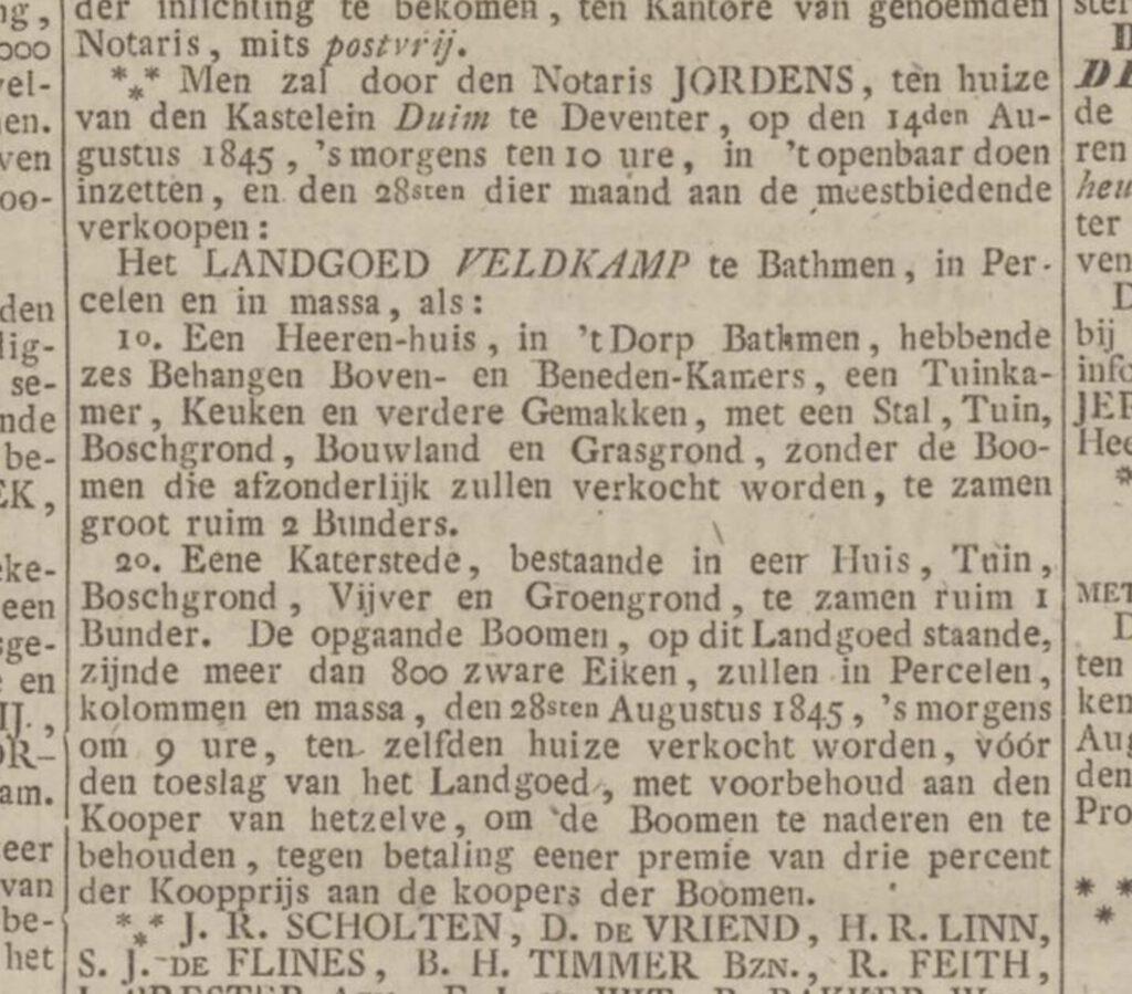 In 1845 werd op een veiling in logement Duijm Keizerstraat 5 in Deventer landgoed De Veldkamp aangeboden in twee aparte percelen. De eikenbomen werden afzonderlijk verkocht. Het 1e perceel met huis Veldkamp werd gekocht door Arnold Gaijmans en zijn vrouw XXXX Stork. Zij bewoonden vanaf 1840 het huis Menop aan de Schipbeek bij Bathmen. Zij verhuurden huis Veldkamp vanaf 1846. Het 2e perceel met katerstede werd gekocht door smid Egbert Bouwhuis te Bathmen.